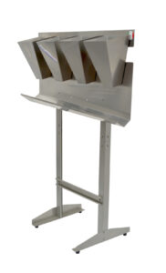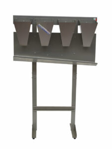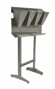 Scannatoio cola-sangue con struttura verticale di supporto, completo di quattro coni cola-sangue e di canale raccogli-sangue inclinato per facilitare la discesa verso il secchio di raccolta.