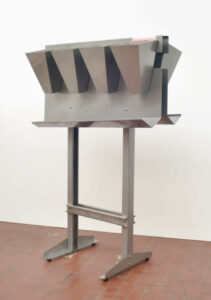 Scannatoio cola-sangue con struttura verticale di supporto, completo di otto coni cola-sangue per avicoli e selvaggina e di canale raccogli-sangue inclinato per facilitare la discesa verso il secchio di raccolta.