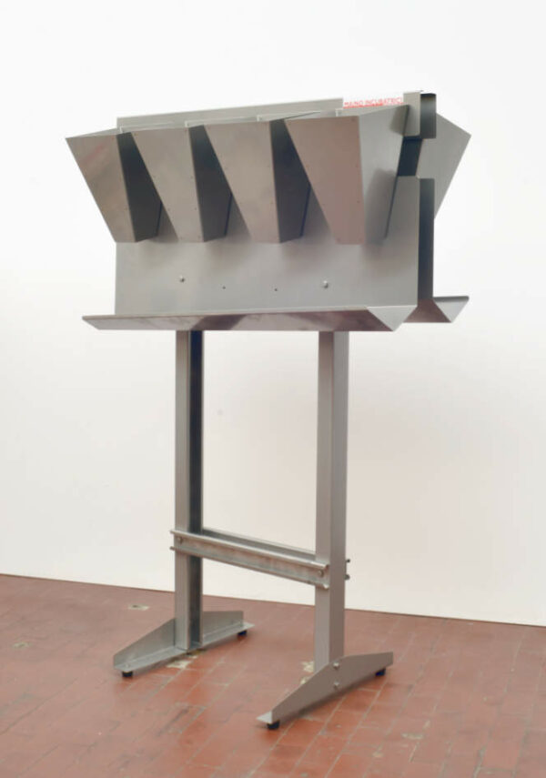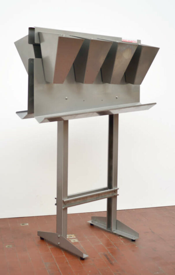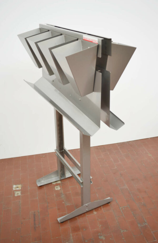 In alto sopra la struttura è presente un ulteriore piccolo ripiano orizzontale con funzione di supporto per gli utensili di sgozzatura e di base di aggancio per i coni.