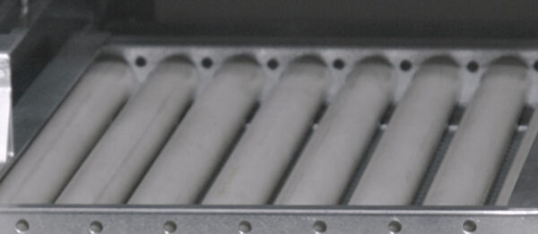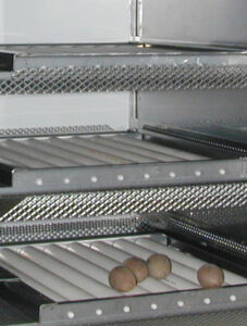 - Con moto rotatorio, le uova vengono appoggiate su ogni livello a rulli attigui in posizione orizzontale. Il supporto a rulli scorre su guide e trasmette il moto rotatorio a bassissima velocità alle uova che rotolano sul loro guscio per 180 gradi (un movimento completo in 5 minuti e pausa fra le rotazioni completamente programmabile tramite timer con display digitale dedicato). Il sistema a rulli è regolabile per estensione del moto (al fine di assecondare diametro e rotazione corretti).